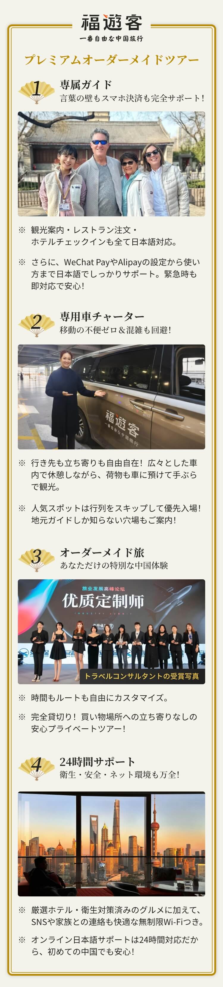 オーダーメイドツアーに加えて、福遊客のサービスにはビザ代行、専属の日本語ガイド、専属ドライバー、ドローンや一眼レフカメラによるプロの撮影サービス、24時間対応のカスタマーサポートなどのワンストップサービスが含まれており、安心して旅行をお楽しみいただけます。