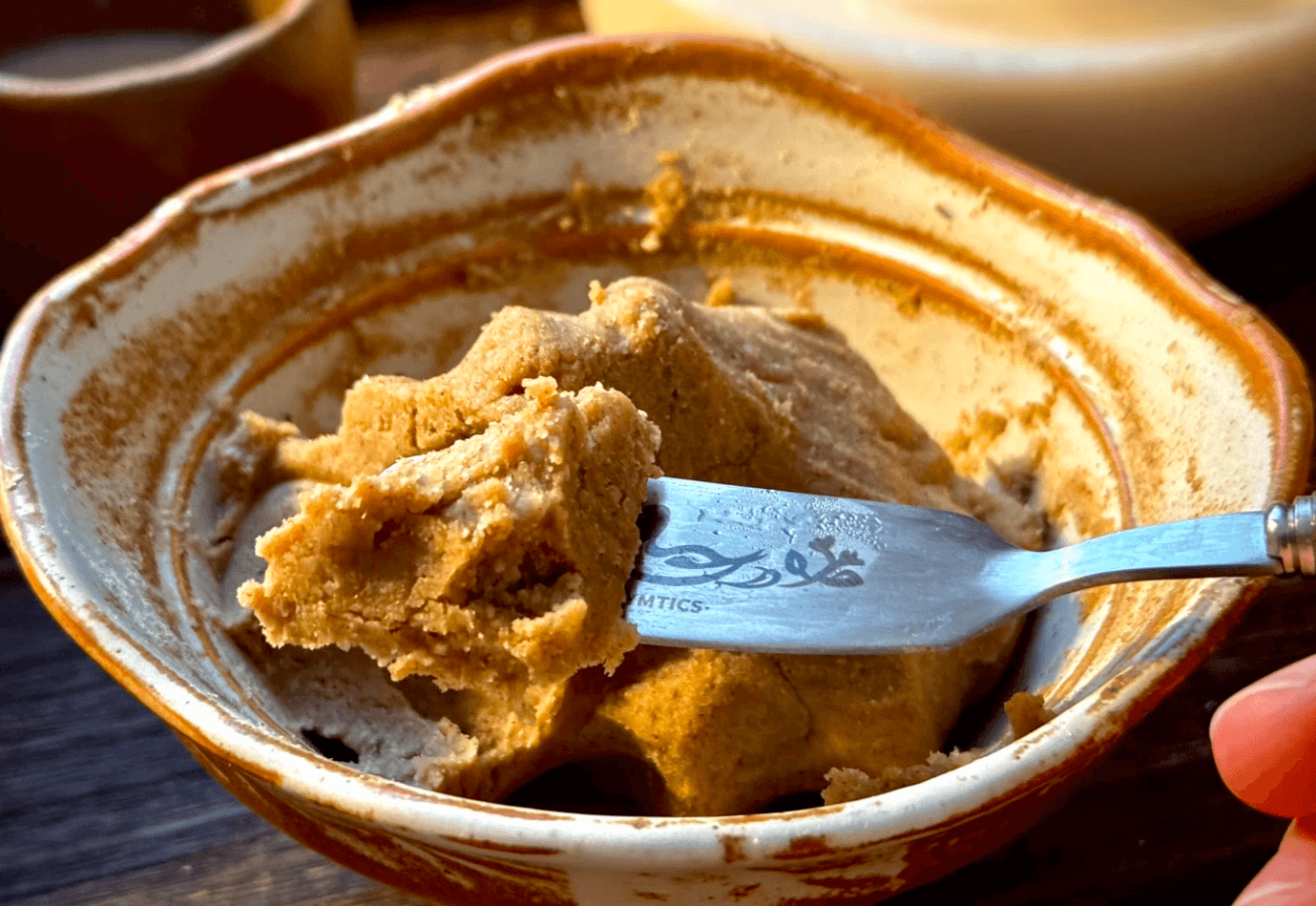 木碗(木の器)に糌粑の粉とバター茶を入れる