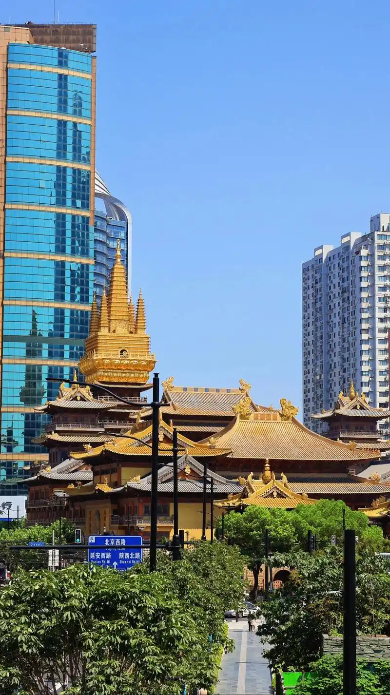 金色に輝く古いお寺で、現代的な高層ビルの真ん中にひっそりと佇んでいます。この古と現代のコントラストが非常に特徴的です。