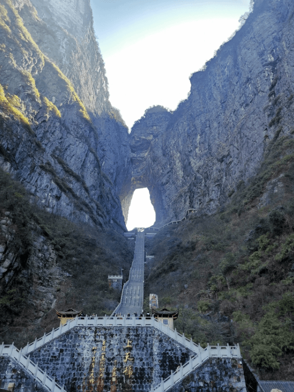 ルート:環保バス+快線索道で天門洞上行 → 999段天梯登頂 → 穿山エスカレーターで山頂巡り → 大索道で下山