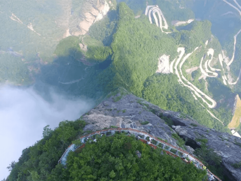 ルート:凌霄台 → 西線ガラス栈道 → 鬼谷栈道 → 懸索橋 → 鬼谷洞 → 天門山寺 → 「さくらベイ」ケーブル(有料)または歩行で雲夢仙頂へ