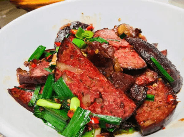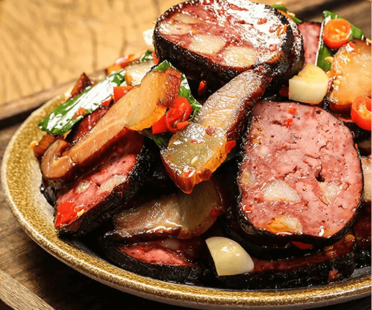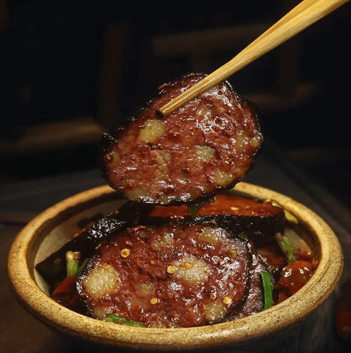 これは一般的な血旺(血の煮凝り)ではなく、湘西の人々の知恵と時間が生み出した腊味の芸術品です。形は球状で、外は黒く内は赤い、年末年始の食卓に欠かせない一品です。