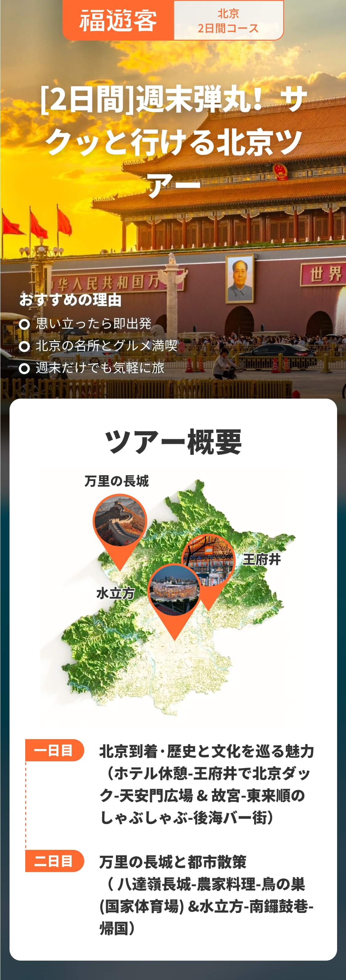 - 午前:フライトの到着時刻に合わせて空港でお迎えし、その後、空港から北京市内のホテルまでお送りします。