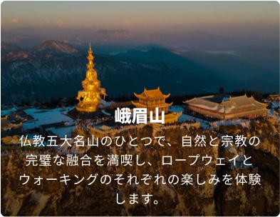 - 午後:楽山大仏から「峨眉山」へ、山麓の見所を巡り、休憩・調整します。