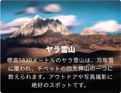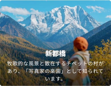 - 見所:牧歌的な風景と散在するチベットの村、「写真家の楽園」として知られています。