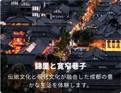 - 見所: 伝統的な成都の街並み文化を体験し、手作り工芸品店を巡り、三大炮、棒棒鶏、糖油果子などの地元の小吃を味わえます。
