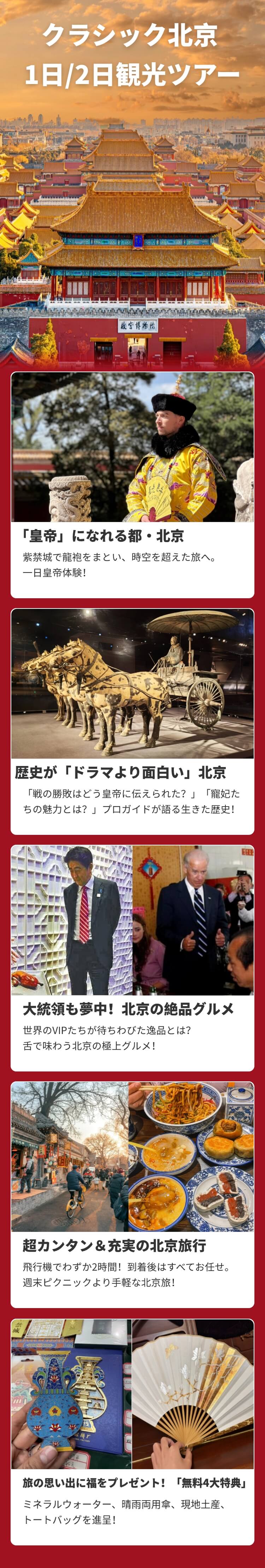 このツアーでは、古代の皇帝たちが愛した名所と美しい庭園を訪れ、歴史の中で特別な体験ができる旅をお届けします。北京の歴史的な建造物や文化遺産を楽しむだけでなく、北京の現代的な側面や地元の魅力にも触れることができる、贅沢な2日間の旅です。