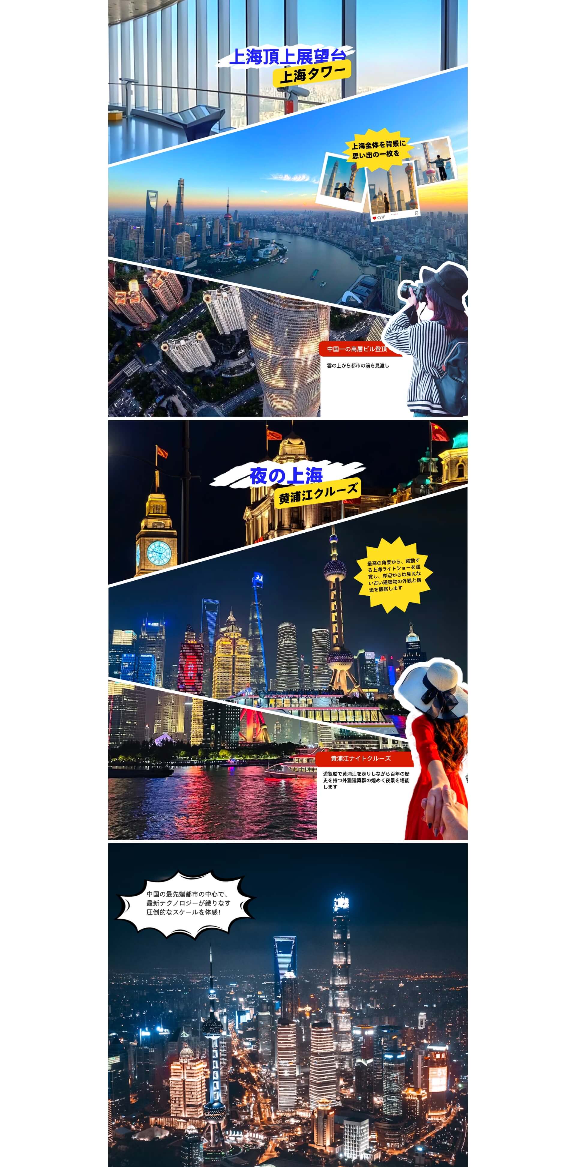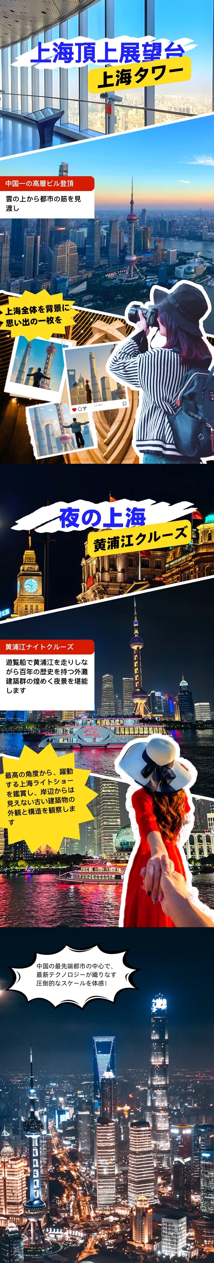 高さ632m、上海を象徴する超高層ビル「上海タワー」の展望台へ。足元に広がる陸家嘴の高層ビル群、蛇行する黄浦江、どこまでも伸びる街のパノラマを一望できます。昼は壮大な都市景観、夜は光り輝く未来都市の夜景を楽しめ、上海のエネルギーと変わり続けるスピード感を最も強く感じられるスポットです。