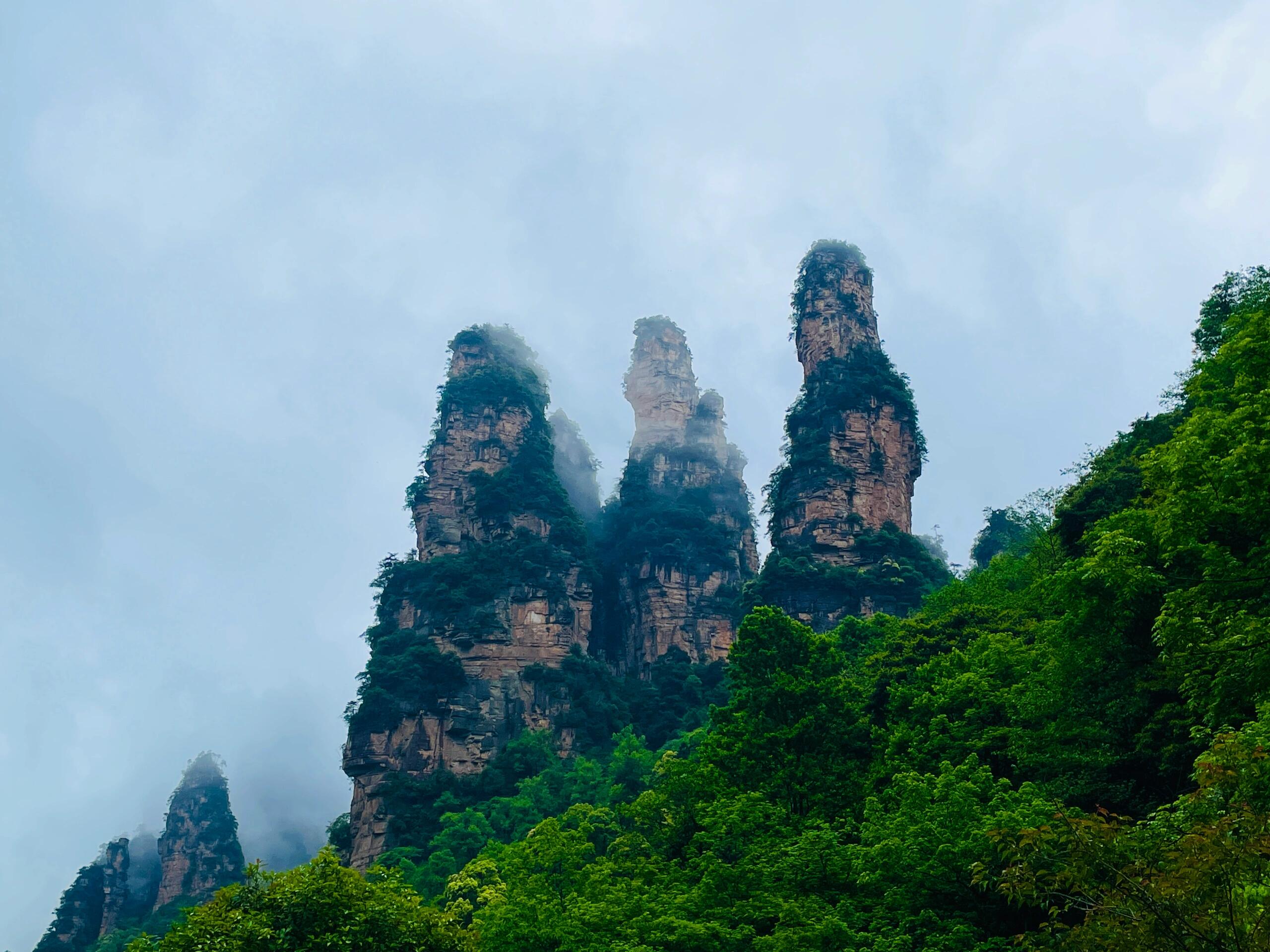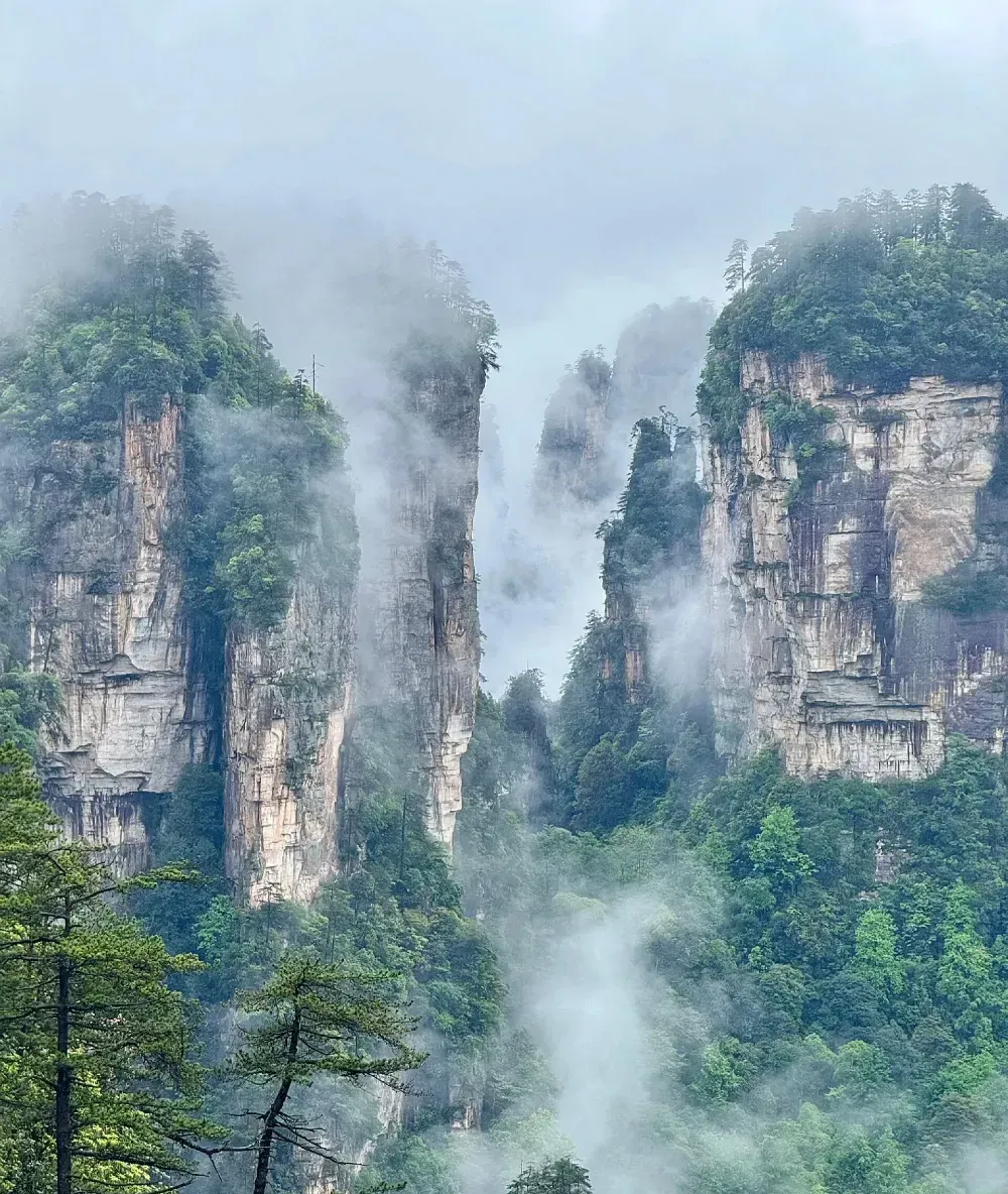 霧が立ち込める中、無数の岩柱が幻想的に浮かび上がります。その姿は「仙人たちが集会を開いているよう」と形容され、思わず時間を忘れて見入ってしまう絶景ポイント。