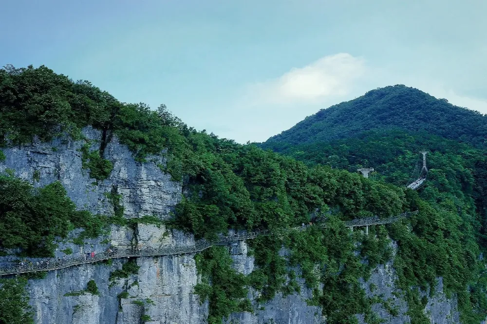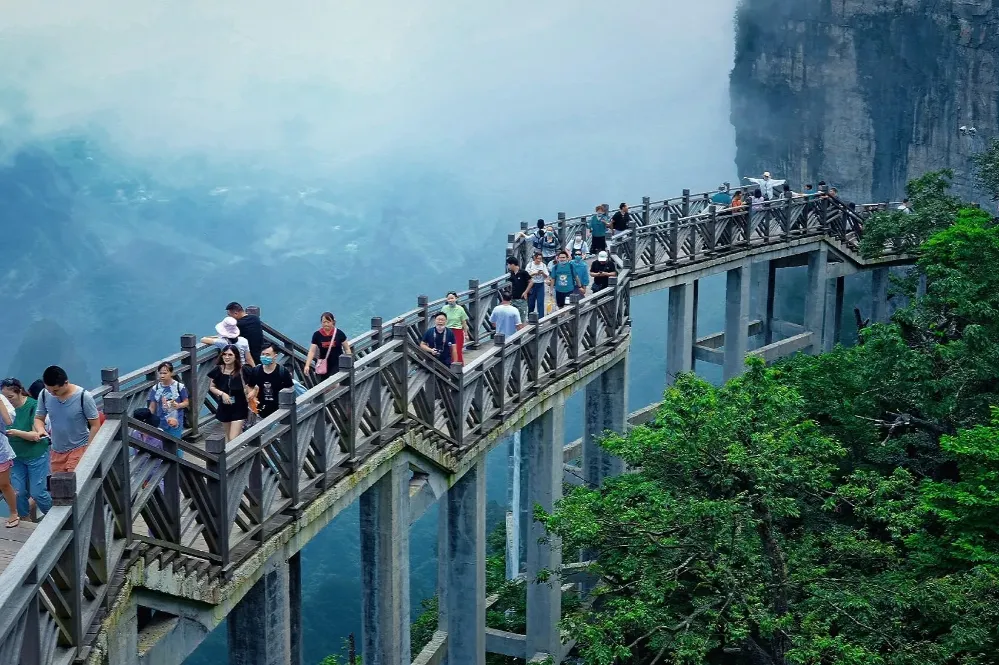 天門山の頂上に到着後、まずはスリル満点の空中回廊を歩きます。これは断崖絶壁に沿って作られた遊歩道で、足元に広がる絶景を楽しみながら、雲の中を歩いているような浮遊感を味わえます。